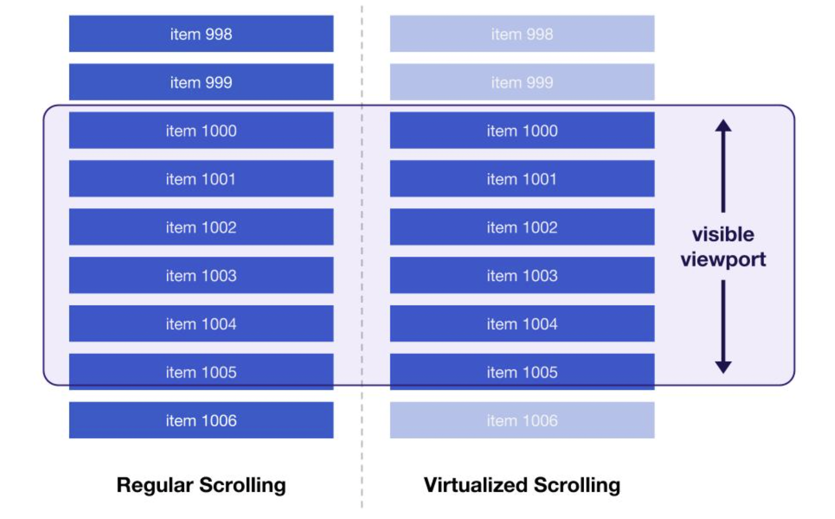 - 간단히 말해, 전체 목록의 일부만 렌더링하는 기법으로, 사용자에게 보이는 것만(viewport 기준으로만) 렌더링하는 것이라고도 이해할 수 있다. 대규모 list들을 효율적으로 렌더링 시킬 수 있다.
