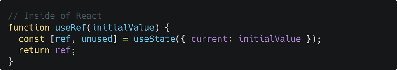 useState와 useRef는 모두 React에서 제공하지만, 원칙적으로 useRef는 useState 위에 구현될 수 있습니다. React 내부에서 useRef는 다음과 같이 구현된다고 상상할 수 있습니다