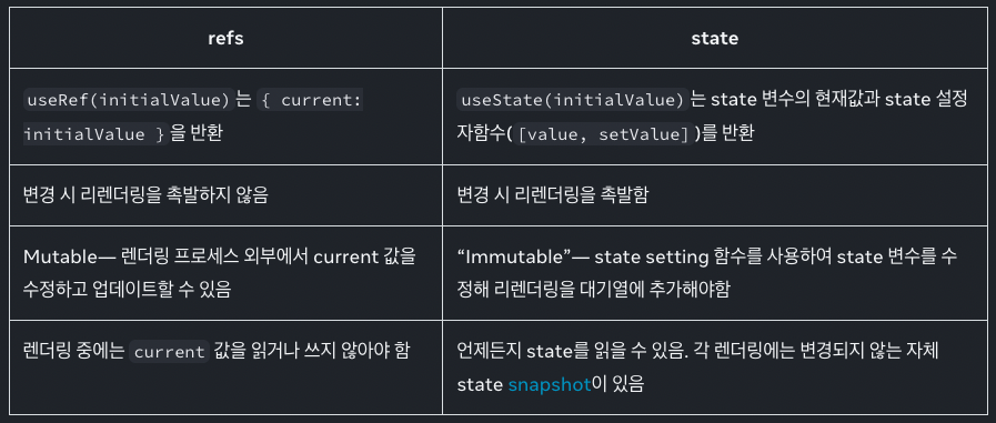 어쩌면 항상 state 설정자 함수를 사용하지 않고도 변이할 수 있기 때문에 ref가 state보다 덜 “strict”하다고 생각할 수 있습니다. 그러나 대부분의 경우 state를 사용하길 원할 것입니다. ref는 자주 사용하지 않는 "탈출구"입니다. state와 ref를 비교하면 다음과 같습니다 ⬇️