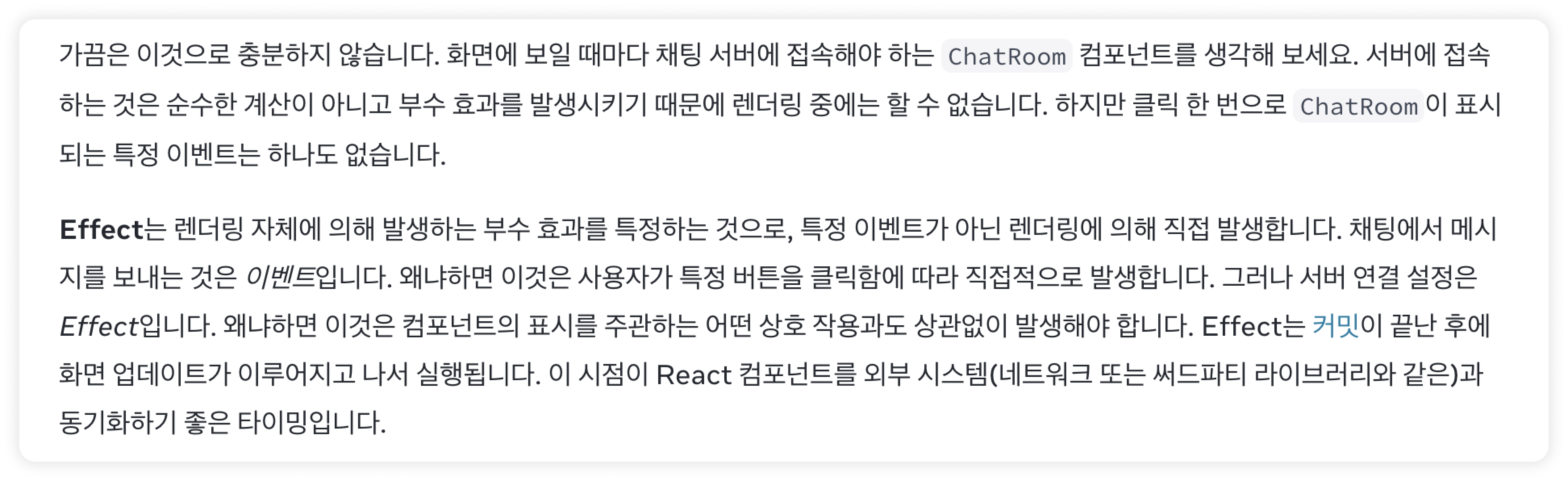 채팅방을 만든다고 상상해봅시다. 사용자가 채팅방 페이지를 열면 이 페이지는 서버와 연결돼야 해요. 그래야 새로운 메시지를 실시간으로 받을 수 있겠죠? 하지만 사용자가 버튼을 클릭해서 연결을 시작하는 게 아니라 채팅방 컴포넌트를 화면에 띄우는 것 자체가 서버 연결을 시작하는 조건이에요. 즉, 버튼 클릭 같은 명확한 이벤트가 아니라 그냥 화면에 컴포넌트를 보여줬다는 사실로 인해 동작해야 합니다.