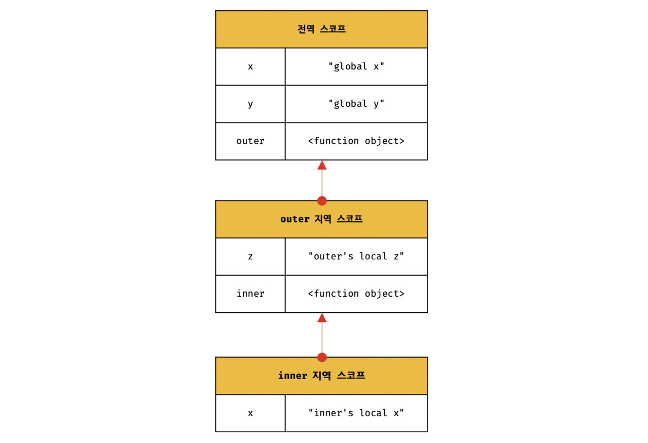위 그림에서 inner 함수는 x 변수를 참조할 때 자신의 스코프에 존재하지 않으므로 상위 스코프 방향으로 이동하며 변수를 검색합니다.