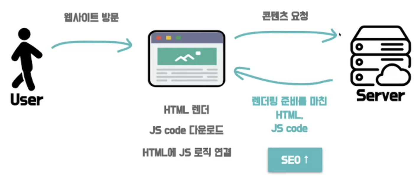 SSR 방식에서는 각 페이지 URL마다 보여줄 내용이 미리 정해져있다. 사용자가 웹 페이지에 접속하면 브라우저가 해당 URL을 서버에 요청하고, 서버는 이 URL을 기준으로 어떤 페이지를 렌더링할지 결정한다. 서버는 렌더링 엔진을 이용해 페이지를 render하고, 완성된 HTML을 브라우저에 응답한다. HTML뿐만 아니라, 필요에 따라 JS 파일 등의 추가 리소스도 포함될 수 있다. 이후 CSR과 마찬가지로 HTML을 해석하여 DOM을 생성하고 수행한다.